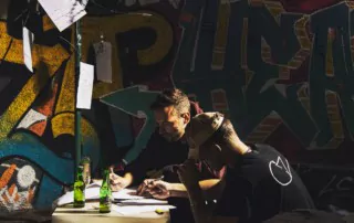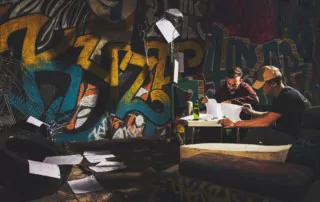 Le brief était de réaliser (à moindre coût) une photo de couverture du duo en train de travailler leurs textes dans un lieu urbain/street un peu trash, et dans un second temps de réaliser une quatrième de couverture avec les deux personnages tenant un panneau sur lequel seraient plus tard inscrits les trois titres présents sur l’EP.